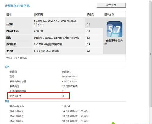 这时候会显示计算机的详细信息,这边会提示你是否支持64位。