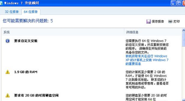 等待一段时间之后,显示结果,如果不支持,会有红叉,下面显示32位和64位报告,点击64位报告,查看有哪些问题。