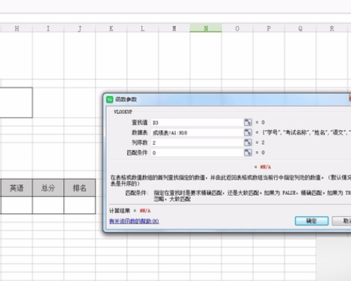 4、选择请输入学号框,此处为D3;数据表-选择sheet2中所有数据;列序数-选择“考试名称”对应的sheet2中的列数,此处应为第2列;匹配条件-0表示精确查找,1-表示模糊查找,此处选择精确查找,则输入0。