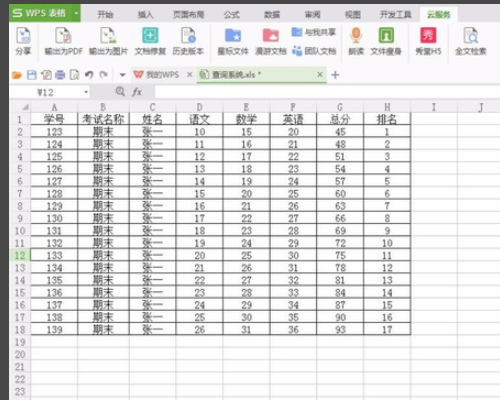 2、在sheet1中建立好查询系统的主页面,以学号为查询条件,结果显示对应学号学生的各科目成绩及其总分和排名。