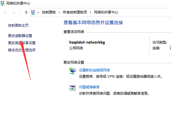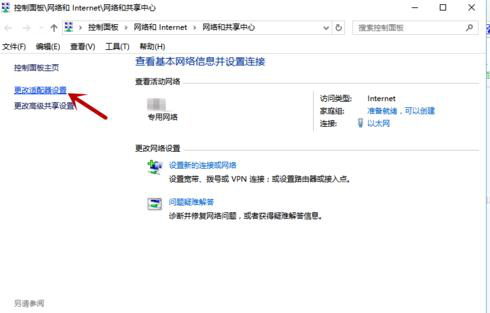 2、 打开网络共享中心后,再点击左侧的“更改适配器设置”。