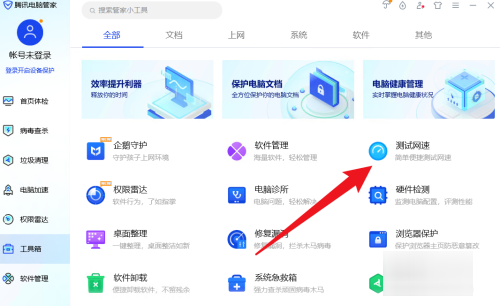 点击测试网速界面的全面检查按钮完成操作。