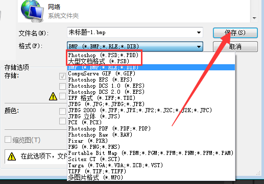 四、如下图,前两个就是psd和大型文档格式psb,根据当前文件高宽大小,选择保存的格式,最后点击保存即可。