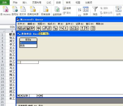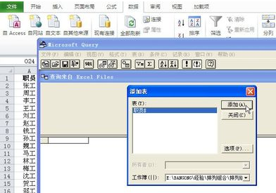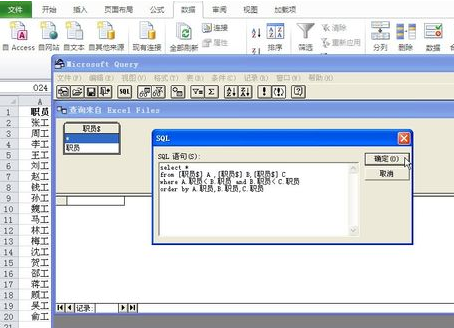 where A.职员 order byA.职员,B.职员,C.职员 点击确定。 8、稍微等待一下,系统会把满足条件所用排列组合显示出来。 9、最后选择Query"文件"菜单下"将数据返回到EXCEL"选项。 10、弹出"导入数据"对话框,鼠标单击D1单元格,确认数据导入在D1单元格,确定,当然也可以把结果放在新工作表中。 11、因为全排列的数据量很大,有969种排列组合,把EXCEL表进行了窗口冻结操作。 12、后续对结果进行处理,打印出抽签条即可。