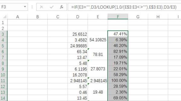 =IF(E3="",D3/LOOKUP(1,0/(E$3:E3<>""),E$3:E3),D3/E3)
