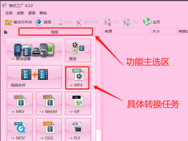 1、在电脑上准备好格式工厂环境,打开进入格式工厂软件。在软件的主功能区中选择“视频”功能,并在视频的下拉列表中选择“MP4”功能。进入“->MP4”转换子界面。