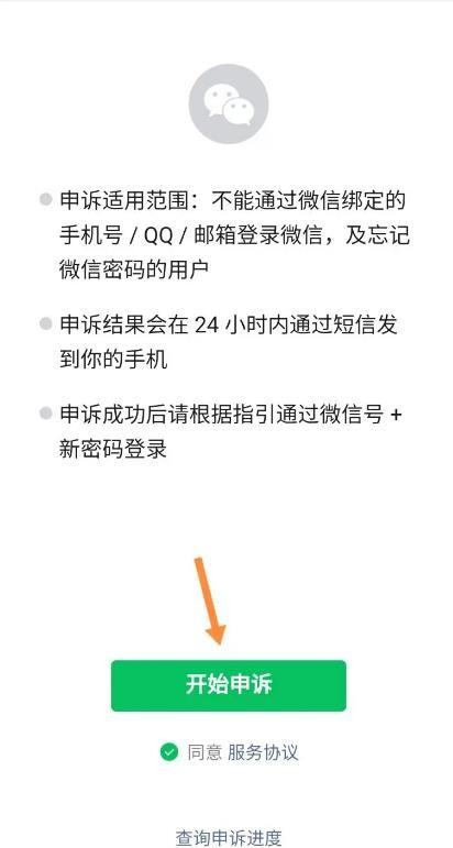3、在微信登录界面点击【找回密码】。点击【申诉找回微信帐号密码】。点击【开始申诉】。选择【我不记得微信号】或【我记得微信号】。通过可用的手机号给微信官方发送短信,申述成功后就可以用新密码登录了。