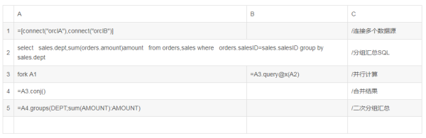 这时候,采用集算器来做后一步的汇总计算就很容易,比如刚才说的分组汇总问题,写出来只要这么几行: