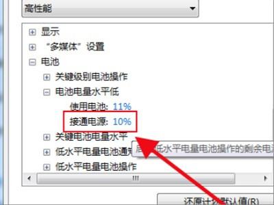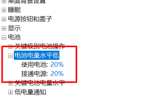 4、找到【电池】->【电池电量水平低】,将其设置高一些,比如20%或者更高。