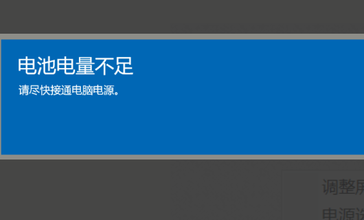 5、把电量消耗在这个水平以下的时候,收到了“电池电量不足”的提示框。先别急着关掉它,此时接入电源适配器。