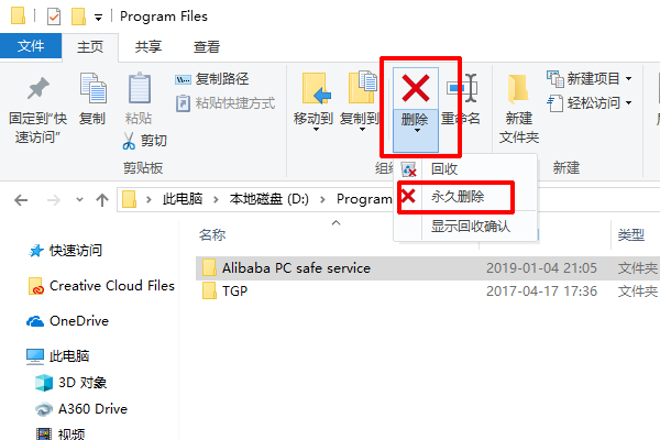 11、选中Alibaba PC safe service,点击上方的删除在下拉菜单中点击永久删除,即可关闭。