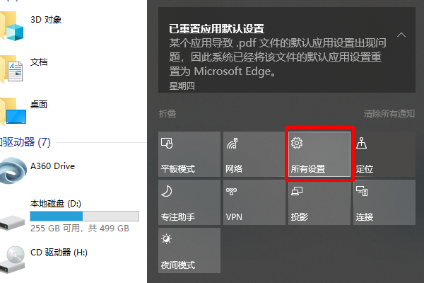 2、点击通知图标后,在弹出的通知中,选择所有设置。
