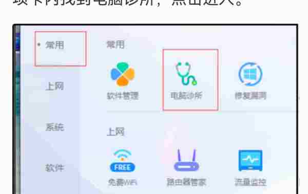 1、浏览器搜索“电脑管家”,下载并安装到电脑中。然后,打开管家,在“常用”选项卡内找到电脑诊所,点击进入。【回答】
