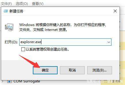 4、输入explorer.exe,然后确定。这样桌面就能出现了。