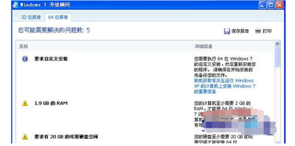 3、等待几分钟之后,检查完成后会显示结果。检测报告包括能否装32位和64位系统的检查结果,其中黄色三角图标表示不符合或存在不兼容的选项,所有条件都符合才能装win7系统,不符合的说明配置确实低,只能装xp系统。