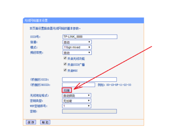 4、然后在桥接的页面点击“扫描”。(WDS的开启是使用无线路由器的桥接功能进行信道的检测。)