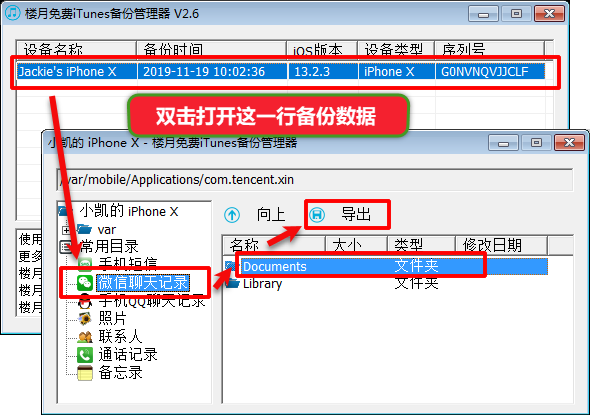 3,使用楼月免费iTunes备份管理器(下载地址:官方下载),提取备份数据中保存了微信聊天记录的Documents文件夹。