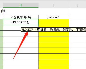 4、接着在单价这列H3单元格用公式VLOOKUP(查找值,数据表,序列数,[匹配条件])。