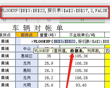 2、再做一个车辆的对账流水表。需要输入地址就会自动显示报价表里的价格。