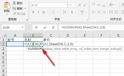 5、在单价中输入公式=VLOOKUP(A2,Sheet2!A:C,3,0)。