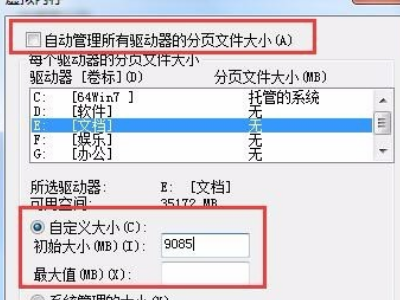 五、去掉“自动管理所有驱动器的分页文件大小”的“√”,选择一个盘符,不建议放到系统盘,可以找一个空间比较大的盘符,自定义大小即可,如果不知道设置为多少,可以设置成下面的推荐值。