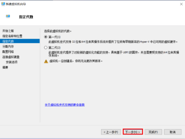 5.在“指定代数”选择虚拟机的代数,第一代支持的操作系统较多,但功能没有第二代丰富。如果要使用虚拟机安装Windows 7或以前版本的系统,建议选择【第一代】。点击【下一步】。