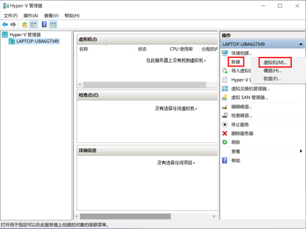 2.左侧显示服务器主机,在右侧“操作”列表中点击【新建】【虚拟机】,进入“新建虚拟机向导”。