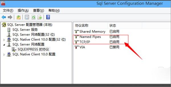 2、其次,完成上述步骤后,在SQLEXPRESS协议中启用“Named Pipes”和“TCP / IP”,见下图,然后进入下一步。
