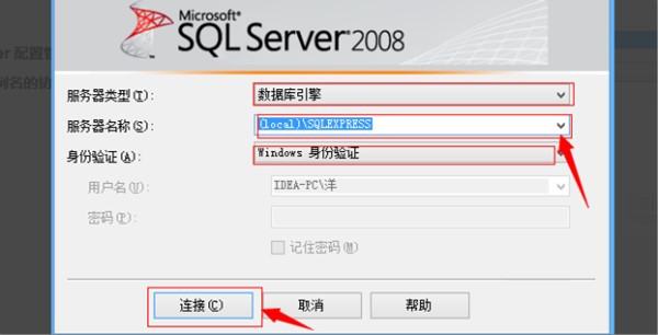 Studio,“服务器类型”选择“数据库引擎”,填写服务器名称(本地)\实例名称或计算机名称\实例名称,然后选择“Windows 身份验证”进行身份验证,单击“连接”按钮,见下图,然后进入下一步。