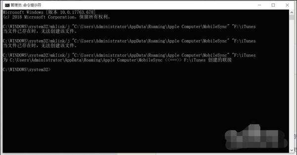 5、按下回车键后,提示创建成功,说明iTunes的备份保存路径已功修改为F盘的iTunes目录。如果创建失败,删除C:\Users\自己的用户名\AppData\Roaming\Apple Computer\MobileSync和"C:\Users\自己的用户名\Apple\MobileSync两个路径下的MobileSync重试。