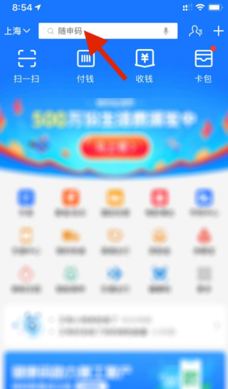 1、首先需要打开手机上的支付宝软件,点击上方的搜索框。
