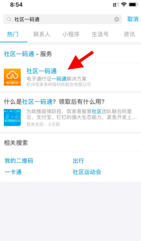 2、在支付宝搜索页面中搜索“社区一码通”。