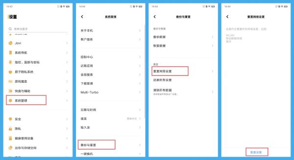 重置网络设置会将WLAN、移动数据网络、蓝牙等网络的连接记录删除,您可进入设置--系统管理--备份与重置--重置网络设置--重置设置--按提示操作即可(双卡时需选择对应的SIM卡)。