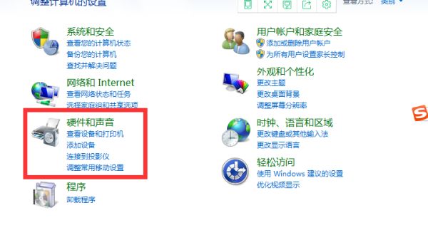 2、然后我们在控制面板的主页面里选择“硬件和声音”,然后点击进入主页面即可。