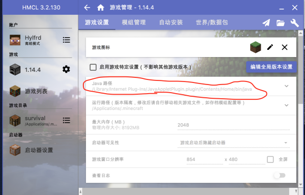 点击游戏(图中所示的1.14.4)右的设置符号---点击游戏设置---即可修改Java路径