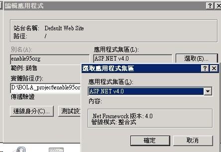 你说的应该是iis7.0吧。找到你的应用程式后,找到基本设定,在里面点击选取ASP.NETV4.0就可以了