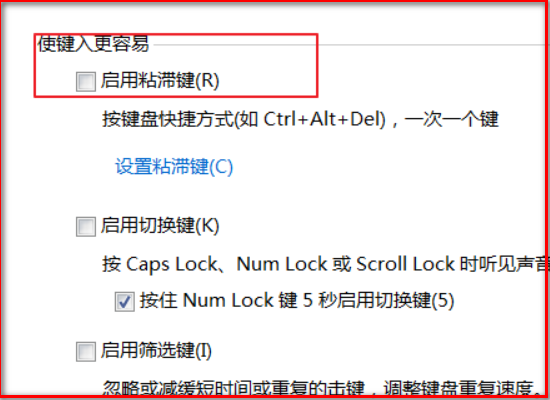 4、在接着自动弹出的界面中关闭“启用粘滞键”按钮即可。