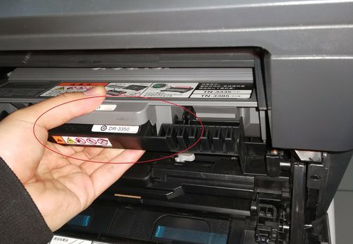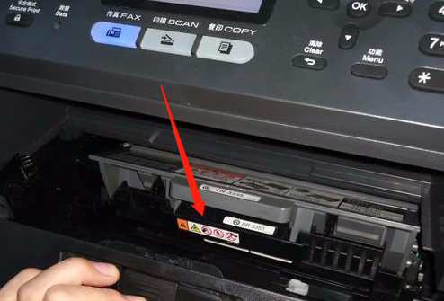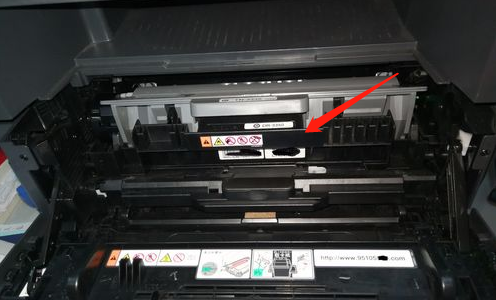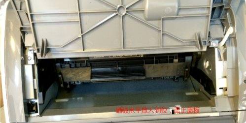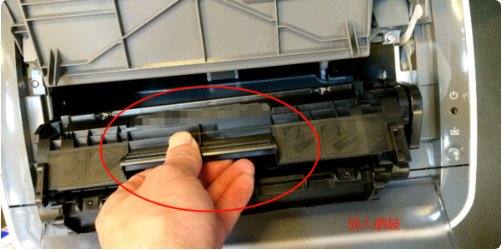 4、然后打开打印机盖板,按图中所示方法将硒鼓放入打印机中,如果不能正确安装防反转装置,如图所示。