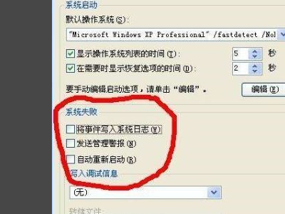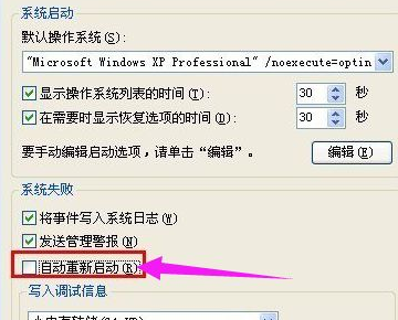4、最后在系统失败选项下将【自动重新启动】的复选框去掉,单击“确定”按钮使设置生效,如下图所示问题就解决了。