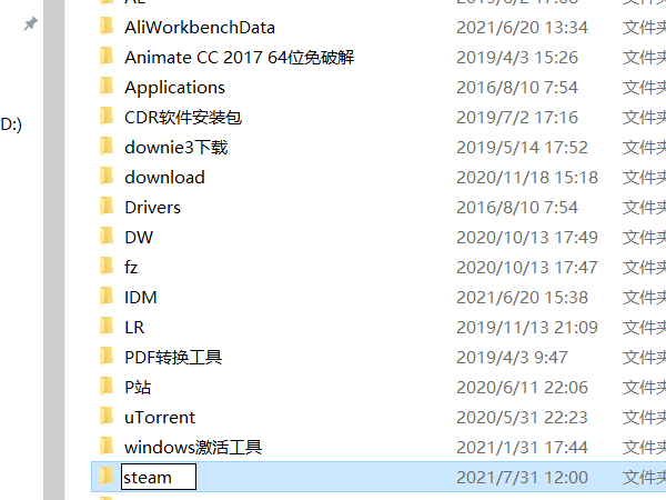 四、将中文名称的文件,改为英文(乱写也行,只要是英文字母就可),这里改为了“steam”,完成后重启软件即可。