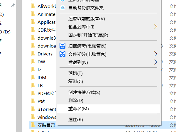 三、在对于磁盘里找到软件安装文件夹,这里是“安装目录”,右键重命名。