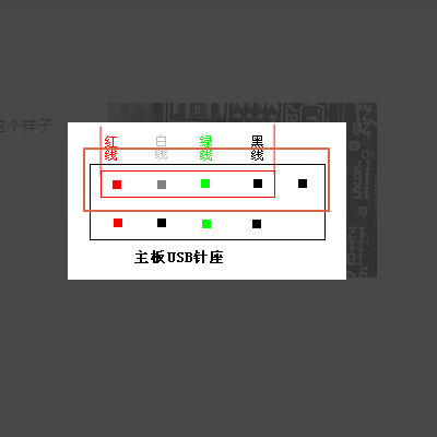 红色代表USB电源: 标有-VCC、Power、5V、5VSB字样。白色代表USB数据线:(负)-DATA-、USBD-、PD-、USBDT-。绿色代表USB数据线:(正)-DATA+、USBD+、PD+、USBDT+。黑色代表地线: GND、Ground。