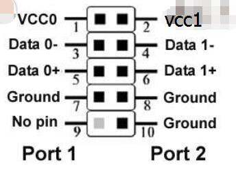 如图所示:GROUND可以接到第八针或者第十针,D+接到第六针,D-接到第4针,+5V接到第二针。这样usb4根线就连接完成,usb即可使用。