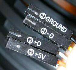红 白 绿 黑 是标准的配线颜色,分别对应1、2、3、4引脚。四根线分别是 1-电源 2-数据 3-数据 4-电源。一般的排列方式是:红白绿黑从左到右。USB是一种常用的PC接口,只有4根线,两根电源两根信号,需要注意的是不要把正负极弄反,否则会烧掉USB设备或者电脑的南桥芯片。