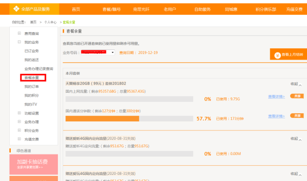 2、登录后会进入个人中心,然后点击导航栏内的套餐余量,然后就可以查看业务使用情况了