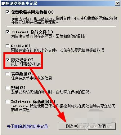 2、在删除面板中,我们勾选【历史记录】,然后点击【删除】如图所示