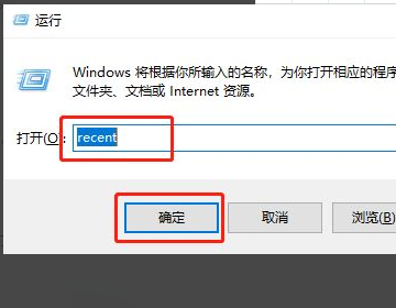 3、接着在运行界面中,输入“recent”并点击“确定”。
