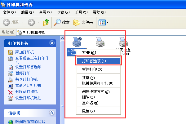 (2)、鼠标右键点击打印机图标,选择“打印首选项;