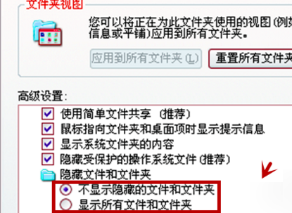 6、在单击查看的高级设置里隐藏文件和文件夹,选择了不显示隐藏文件和文件夹,所以在电脑上不能显示U盘中的文件。