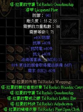 绿装的话,你把鼠标放在装备上面,是可以看到套装的全部名称的,如下图的“塔拉夏套装”: